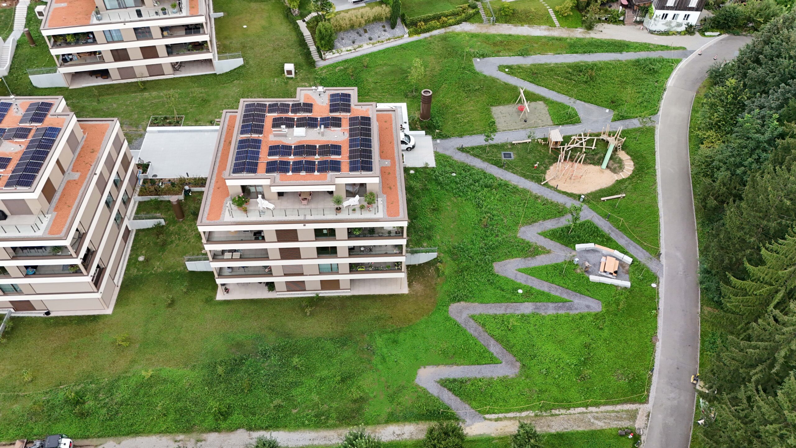 Bei der modernen Überbauung der Bauherrin acasa Männedorf an der Glärnischstrasse erstellten unsere Gärtner Rohplanien, gestalteten das Terrain, erstellten Beläge mit Zementpflästerung, machten die Randabschlüsse und Asphaltarbeiten und erstellten die Chaussierung im Spielplatzbereich. Sie setzten Sträucher und Bäume inkl. der Unterpflanzung und legten Wiesen- und Rasenflächen an. Zudem richteten sie die beiden Spielplätze ein. Sie setzten Winkelplatten ein und brachten Sitzgelegenheiten an. Auch nach der Fertigstellung der Umgebungsarbeiten sorgen sie für gepflegte Rabatten und einladende Sitzecken.